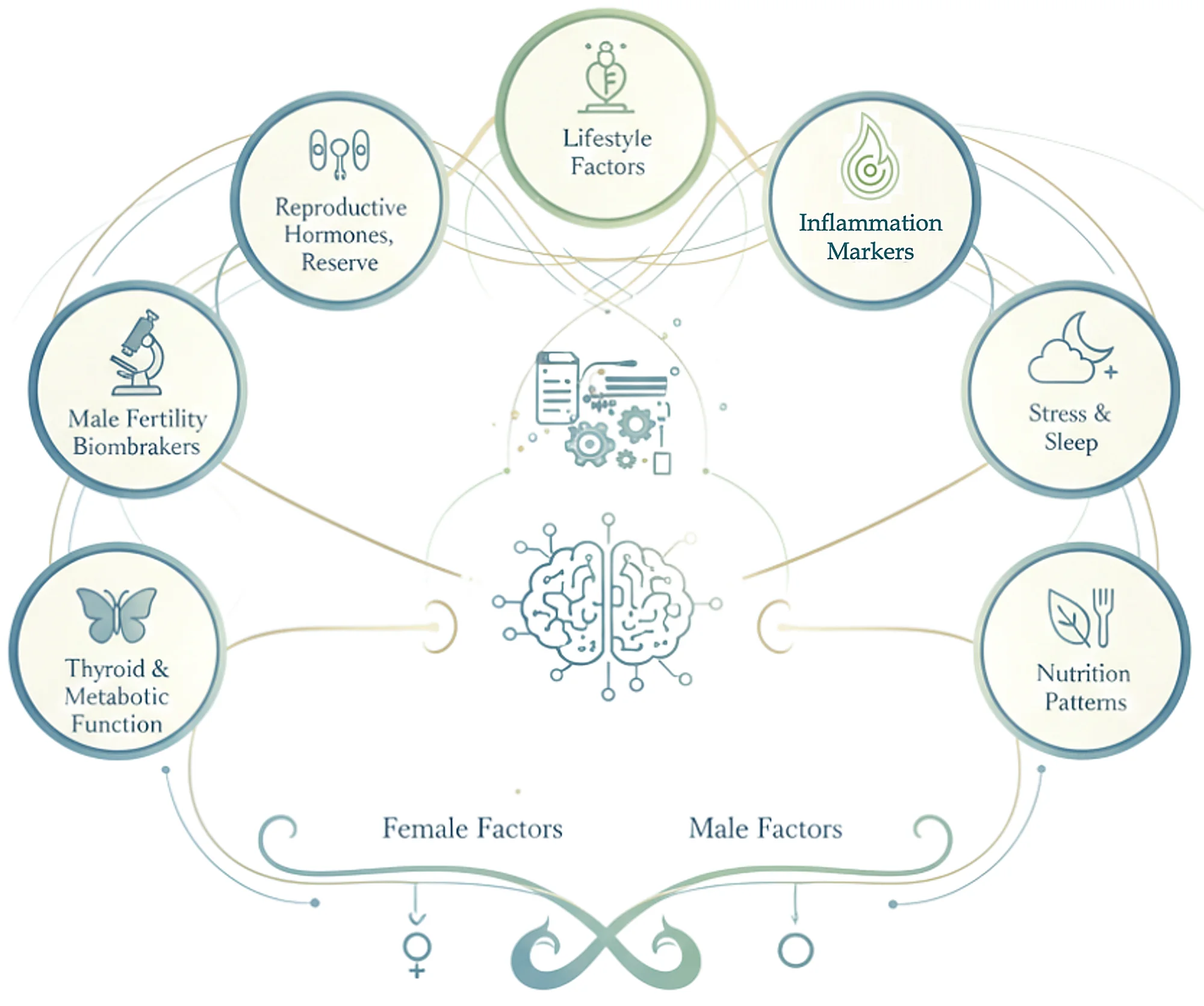 Modern fertility care requires integrating multiple data streams: reproductive hormones, ovarian reserve indicators, male fertility biomarkers, thyroid function, metabolic panels, inflammation markers, and lifestyle factors including stress, sleep, and nutrition patterns.